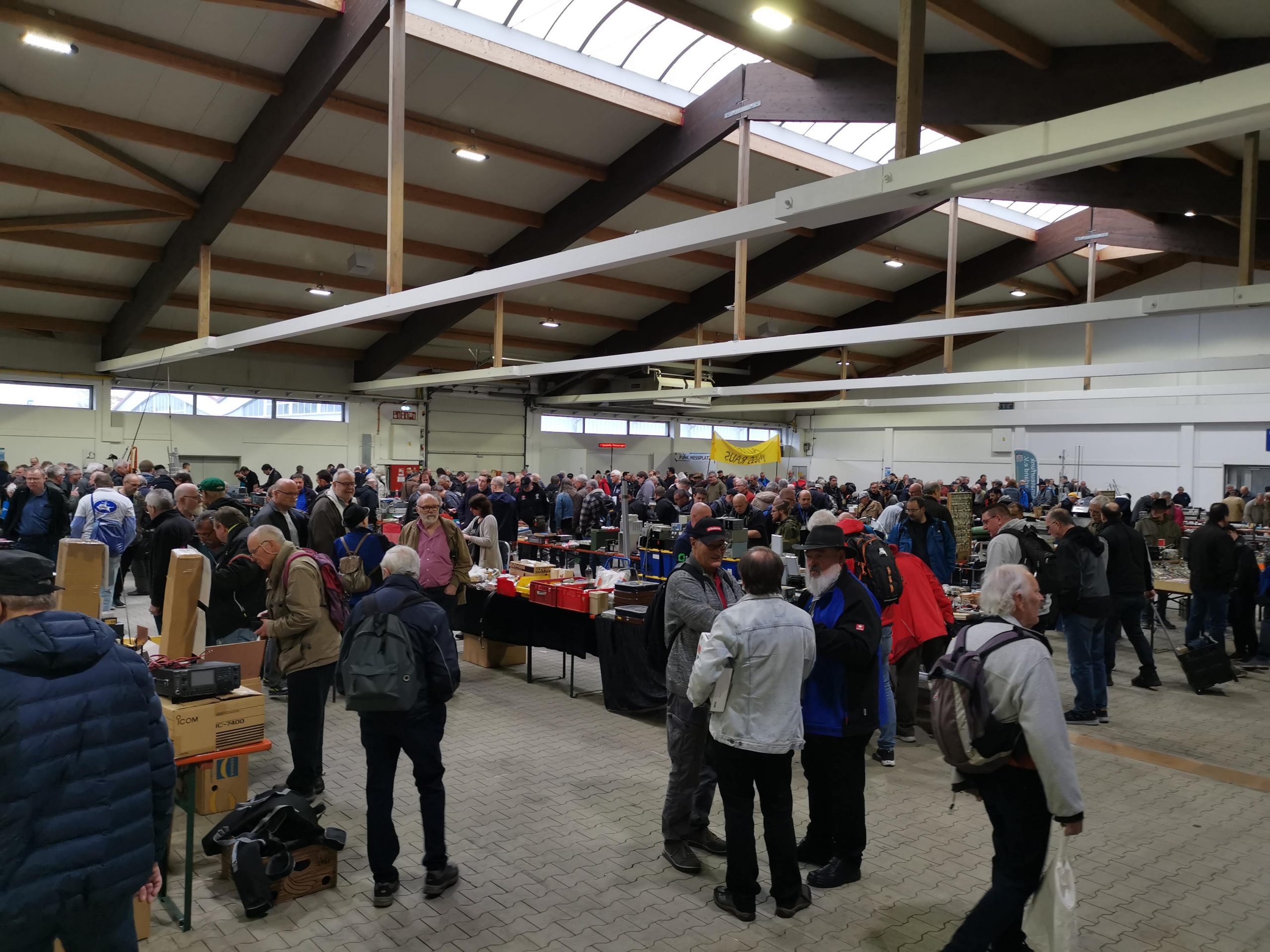 ... Auch auf dem Flohmarkt war bis nach 09.00 Uhr wenig los. Aber dann ging es dort so richtig rund. Und damit wären wir auch schon beim Amateurfunk-Flohmarkt. Während alles zunächst eher gemächlich zuging, waren ab 10.00 Uhr die Gänge zwischen den Ständen sehr gut gefüllt. Im Gang vor der Bühne war richtig Betrieb . (dort hatte ein wohl beliebter Händler seinen Stand in voller Breitseite der Bühne) Nun es ist ja u. a. der Sinn und Zweck solcher Märkte, dass der Funkamateur seine Wünsche erfüllt bekommt und der Händler gut verkauft. ...